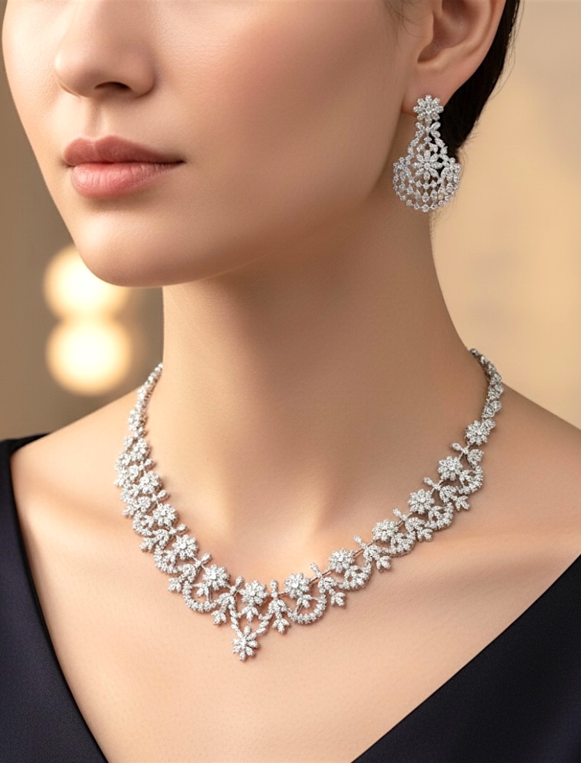 Description: Silver jewelry that speaks sophistication and contemporary charm. Diamond style jewelry in high quality materials including German silver, zirconia and American diamonds and colored stones. Our Glam collection Necklace Sets that are versatile to style and dazzle bright. Adorn yourself in glamour with scintillating glam collection. Enjoy the luxury experience with Jewelex Jewelry.