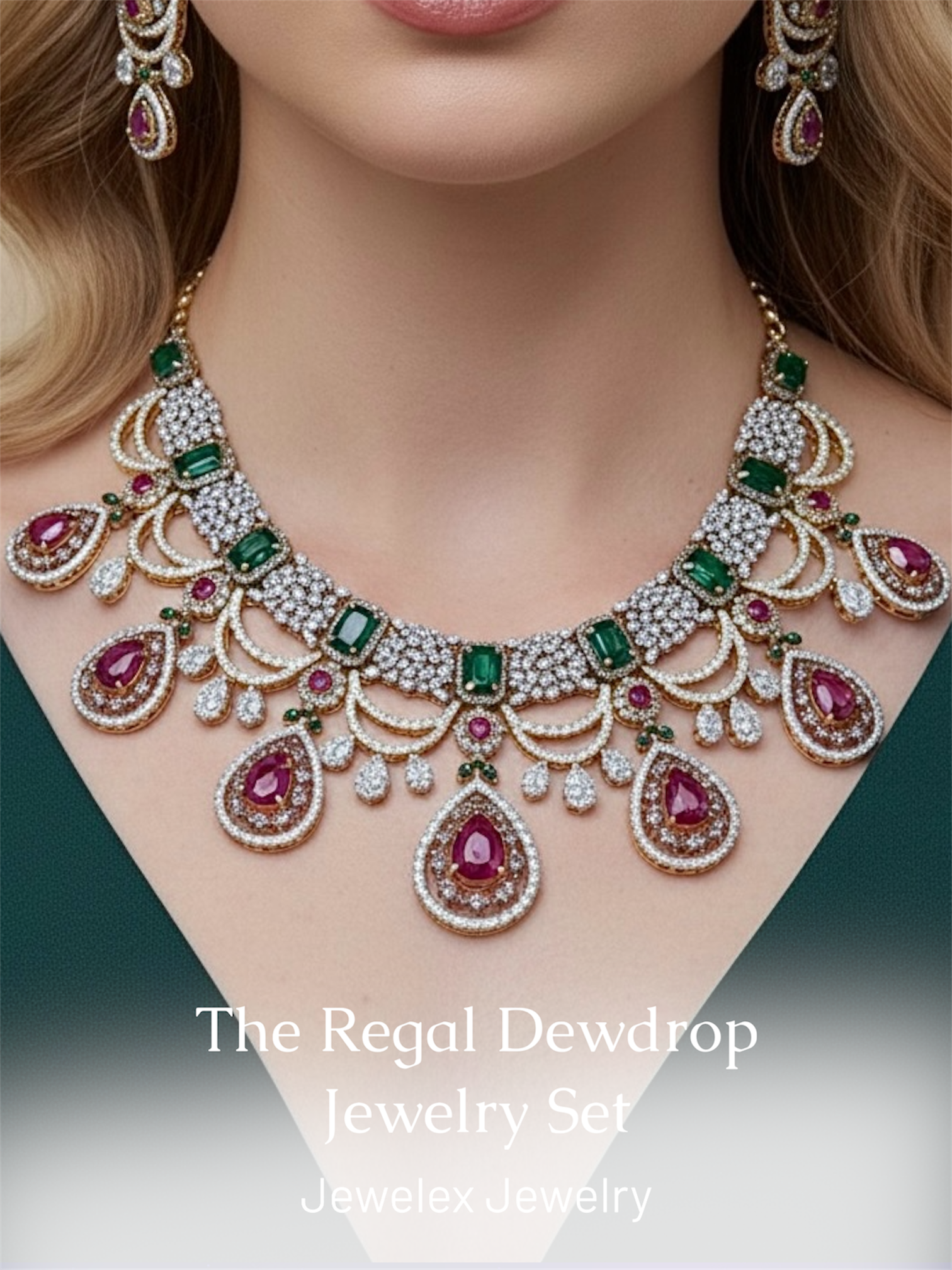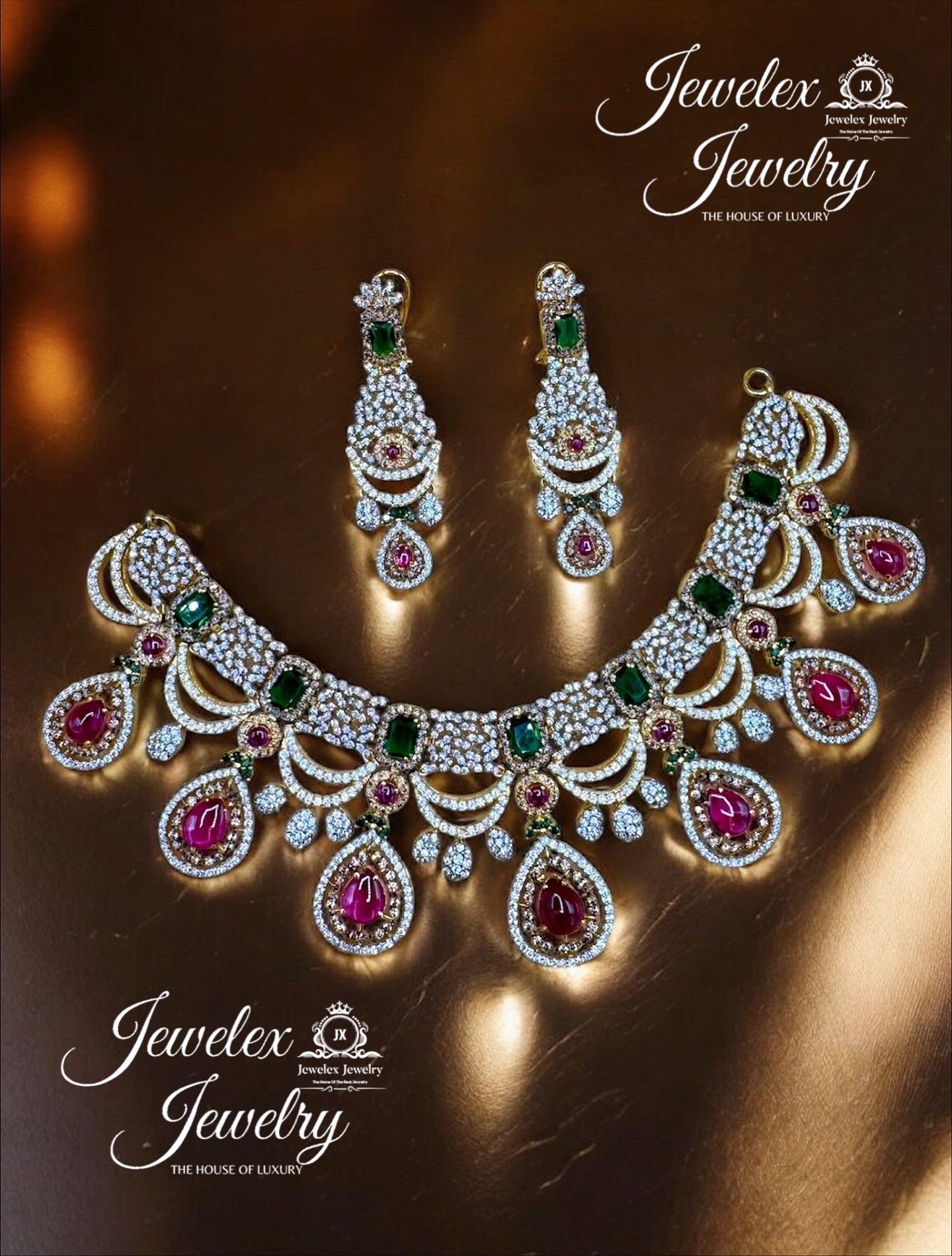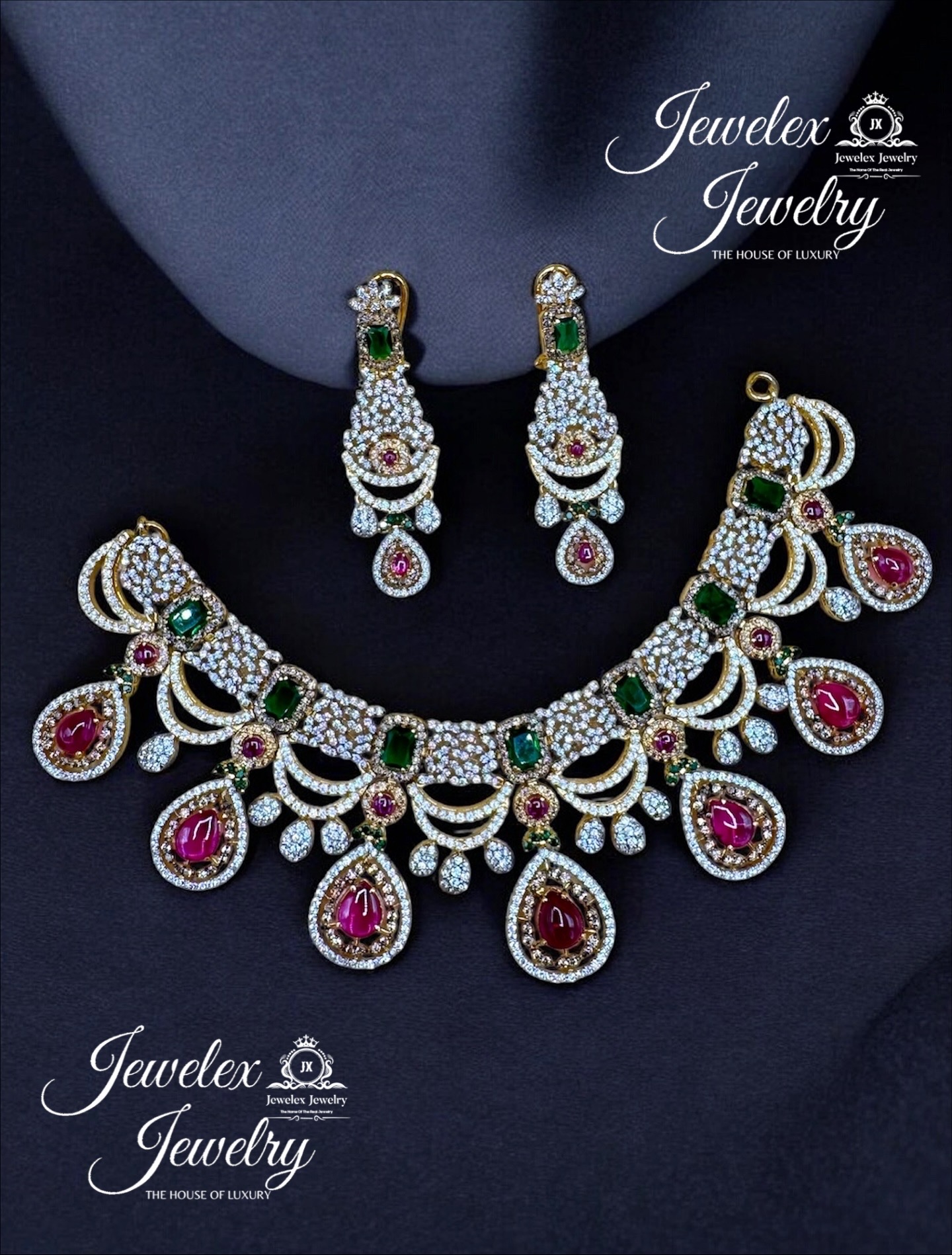 Description: Dazzle and tradition intertwined, adorned in the colors of royalty and the sparkle of starlight. Diamond style jewelry in high quality materials including German silver, zirconia and American diamonds and colored stones. Our Glam collection Necklace Sets that are versatile to style and dazzle bright. Adorn yourself in glamour with scintillating glam collection. Enjoy the luxury experience with Jewelex Jewelry.